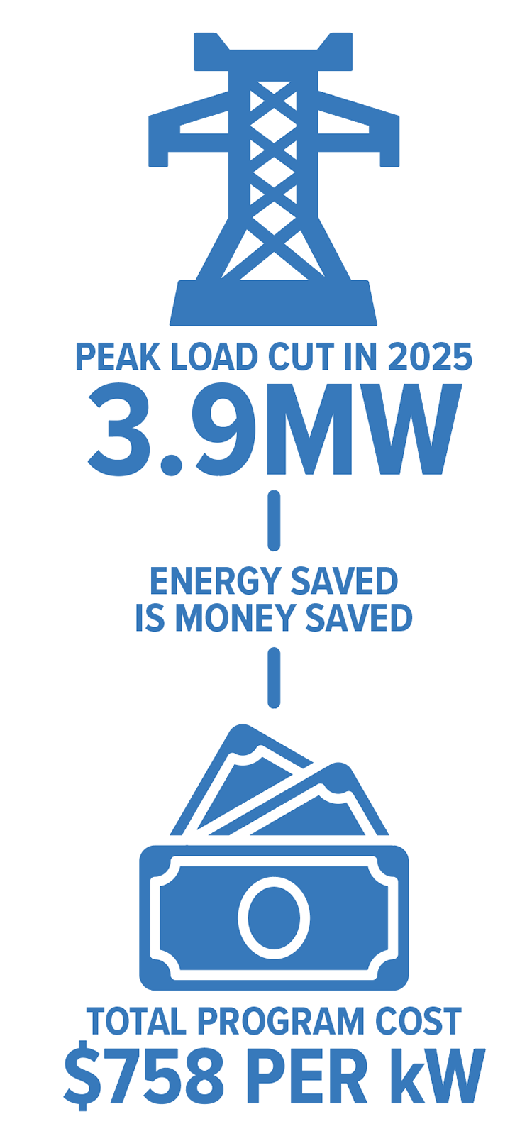 The Bright Energy Solutions (BES) program cut about 3.9 megawatts (MW) of peak load in 2025 with a total program cost of $758 per kilowatt (kW). Since 2008, BES has reduced peak demand by almost 100 MW, averaging about $574 per kW.